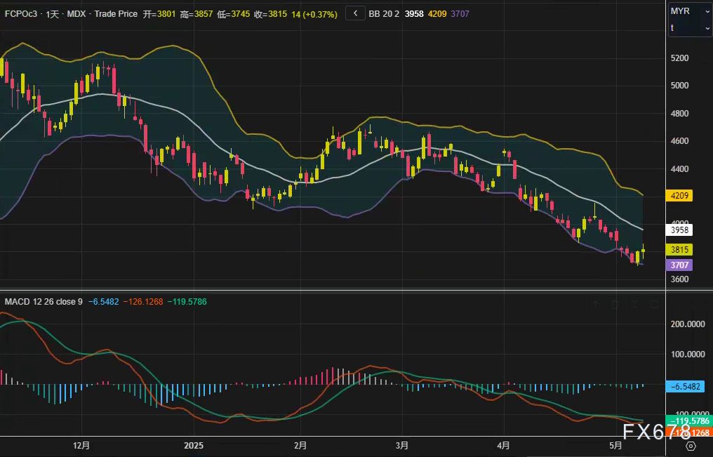 嘉盛——周五(5月9日),马来西亚衍生品交易所(BMD)棕榈油主力合约FCPOc3收报3815林吉特/吨,日内上涨0.37%,但周线仍录得1.7%跌幅,连续第二周收阴。日线级别技术指标显示,布林通道(20,2)中轨位于3958林吉特,MACD柱状图虽收窄至-119.578,但双线仍深陷负值区域,暗示市场尚未摆脱弱势格局。