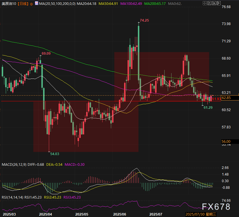 (MM情绪指标图,图中显示市场情绪偏悲观)   油价守住上半箱体下沿,每次遇到箱体下沿都是做多的机会得到验证。后续有望继续在上半箱体中运行。   自从上涨趋势线被跌破后,市场预期的油价弱势震荡转为下跌并未得到验证,油价始终未能创下更低低点,暗示横盘整理格局正在形成。在此背景下,中立情绪料将主导短期价格波动,需等待更强催化剂打破僵局。   RSI线维持上行斜率,逐步逼近50中性关口,表明短期多空动能趋于平衡,市场情绪偏向中性。MACD柱状图在0轴附近震荡,进一步印证短期走势缺乏明确方向。   主要阻力位(50日与200日移动平均线交汇)若持续突破,将确认看涨趋势,打开上行空间,64美元即时阻力位(61.8%斐波那契回撤位)突破后或激活新一轮买盘动能,目前可以观察近期的高点63美元,作为多头进攻的前哨。60美元心理关口是关键支撑位跌破将验证看跌格局,下行动力增强。