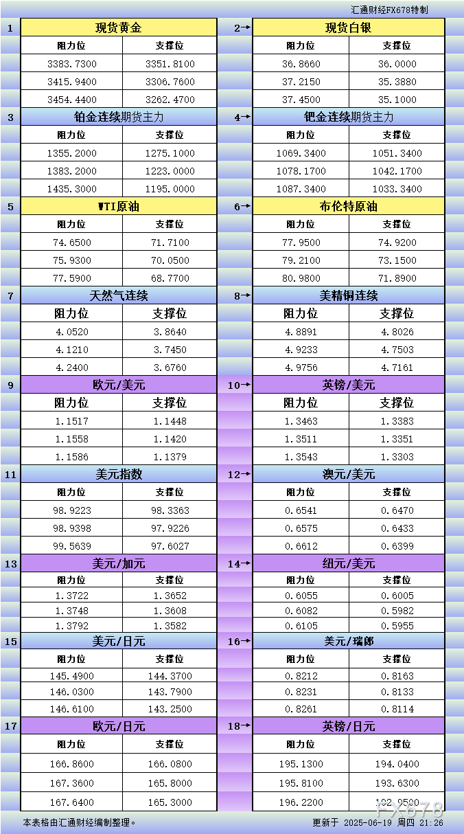 嘉盛外汇官网:6月20日亚市更新支撑阻力:18品种支撑阻力(金银铂钯原油天然气铜